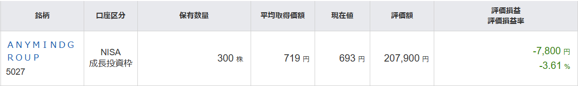エニーマインドグループは戻してくれるかなと思って先週に購入しましたが、思い通りの戻しにならなかったので損切りをしました。